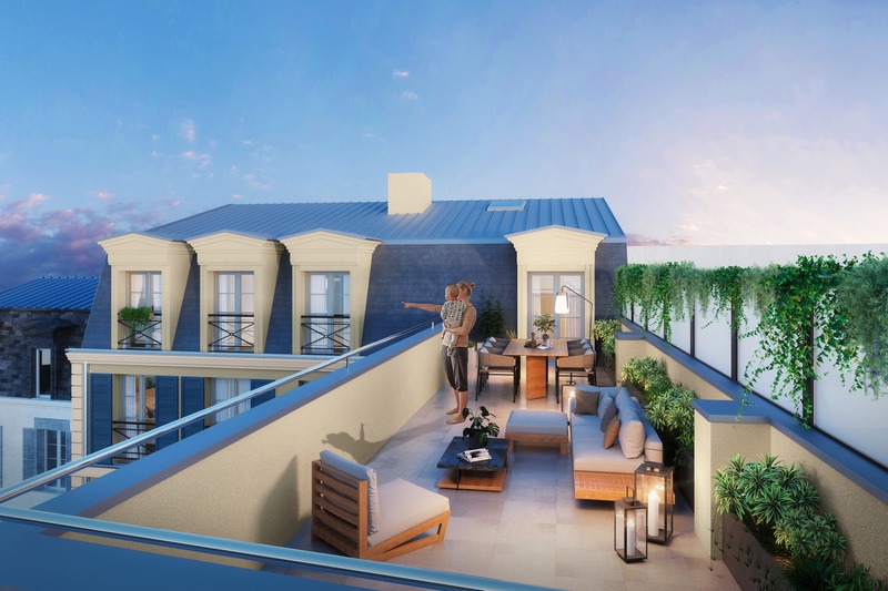 Parent et enfant sur la terrasse d’un appartement neuf au dernier étage à Paris